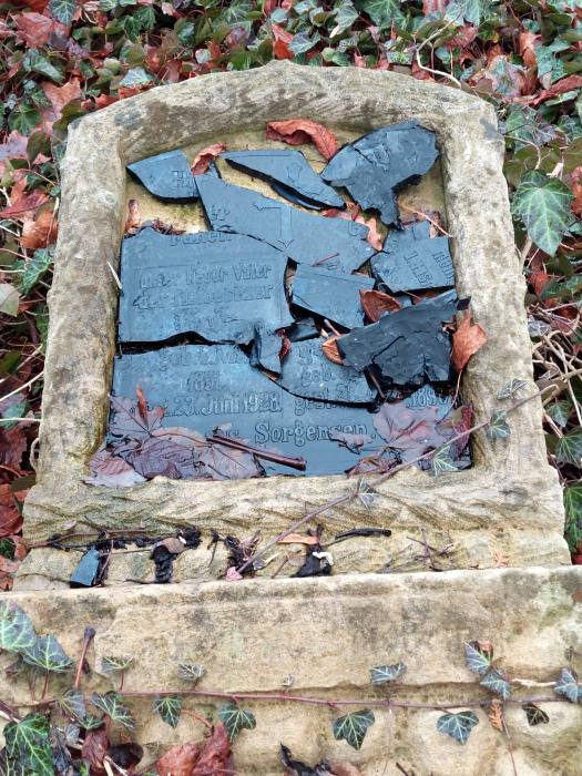Schriftplatte auf Grabstein zerstört